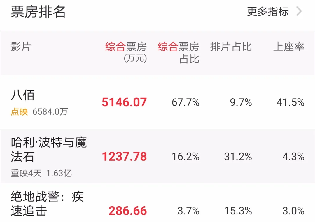 首日点映就拿下1435万元的票房,虽然排片才3.5%,但《八佰》还是冲上日票房排行榜第二的位置,只因它上座率就高达33%。