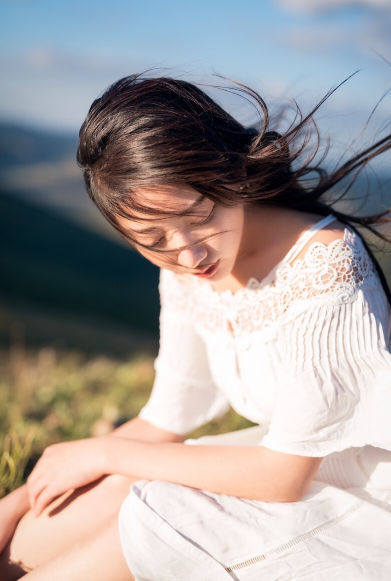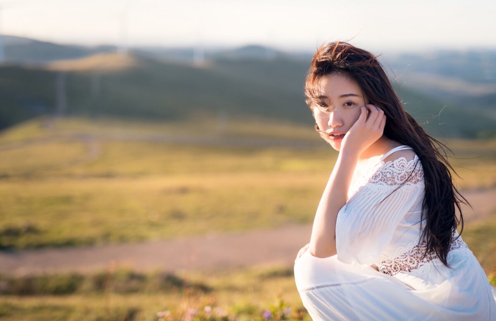 虽然户外的风景很美,但如果全是风光人像未免有些审美疲劳,因此大家可以多拍一些近景或特写照,但对于脸大或脸圆时,更推荐你低下头拍,无需过多姿势和技巧的修饰,配合上风吹头发和光线的运用,既显脸小又能拍出情绪大片的美感。