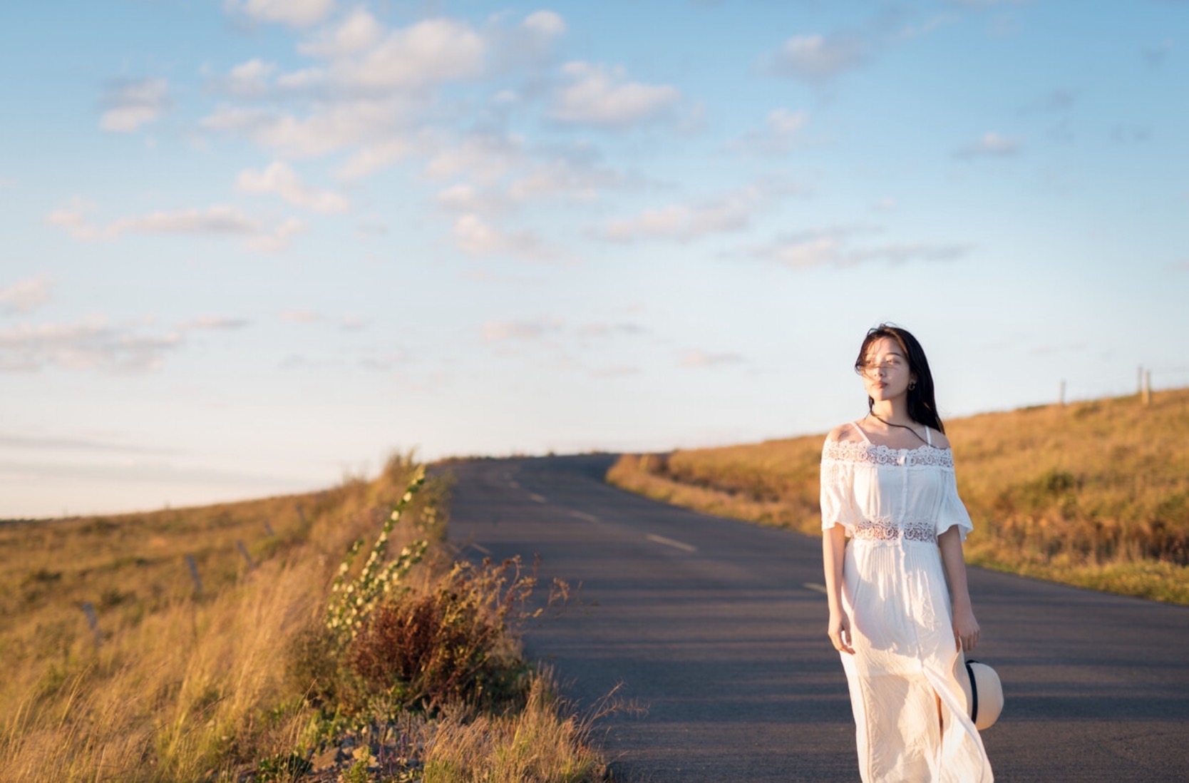 户外少人的公路也是很好的拍照点,站在公路上拍照时,可以借助两边的道路起到增加画面纵深感的效果,让成片更有视觉上的冲击力,也能很好的突出美美的自己,但记得要文明和安全拍照。