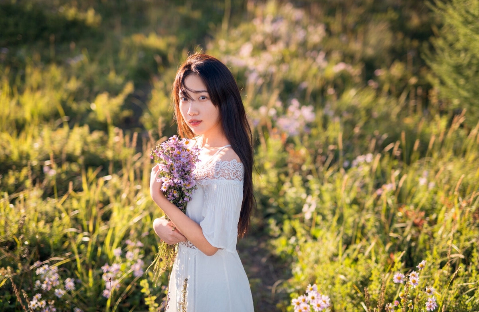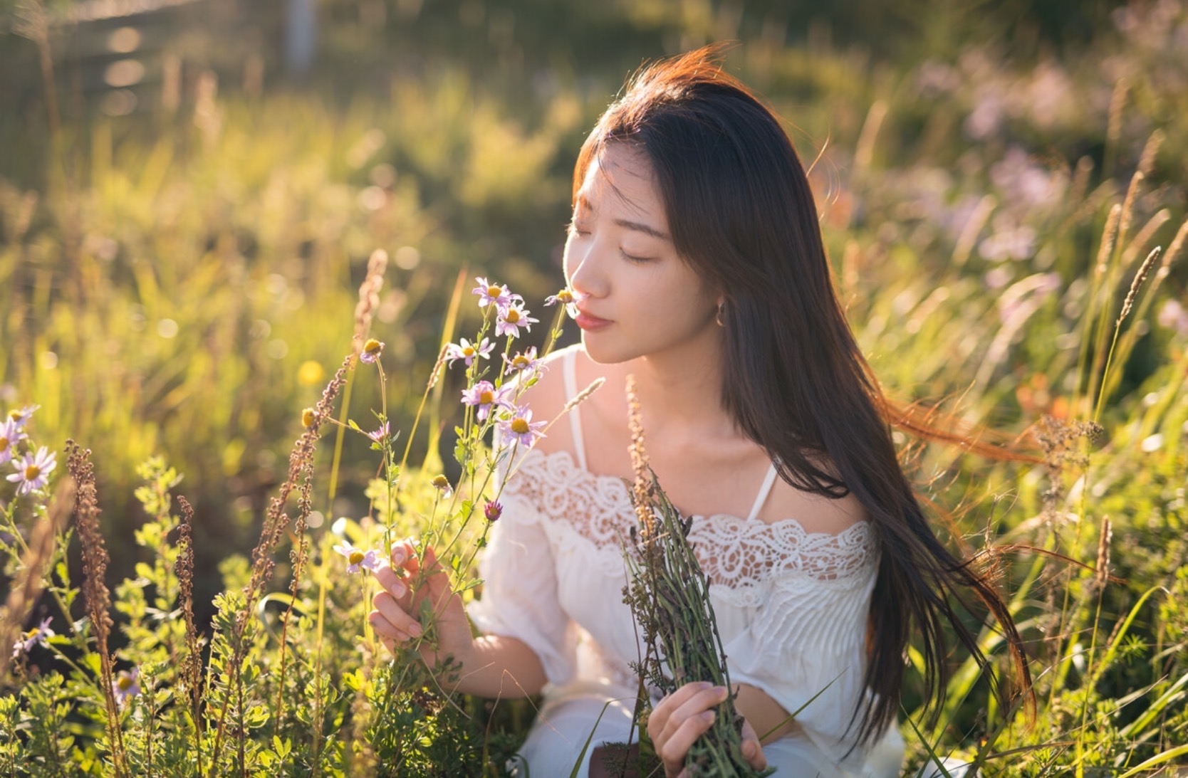 户外随处可见的野花也是很好的拍照场景,如果你不知道该怎么摆姿势,可以和这些好看的花花草草来个互动,像下面的女生一般,蹲在花丛中,拿起花来假装闻闻花香,既能和场景互动起来,又能更好地融入拍照场景,也很好看。