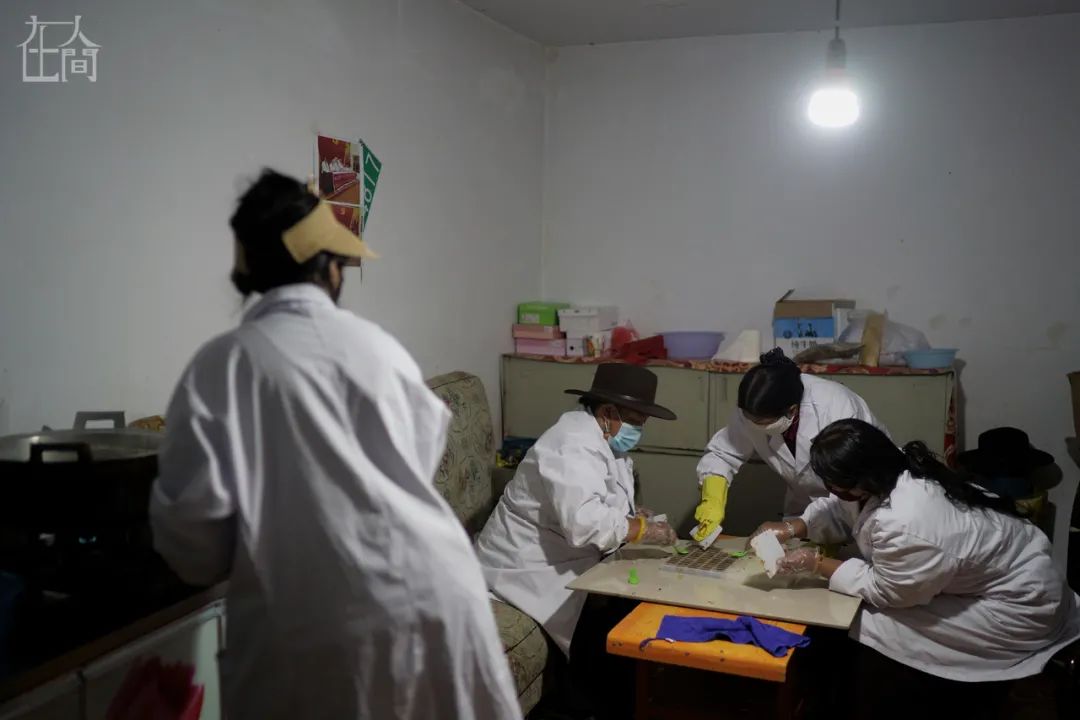 小组成员拉毛永藏的儿子结婚前夜,妇女们正忙着制作新式藏糖,给新人送去祝福,妇女们穿起白大褂、戴上口罩手套,这次,他们一共做了木糖醇、核桃、咖啡三种口味的藏糖。