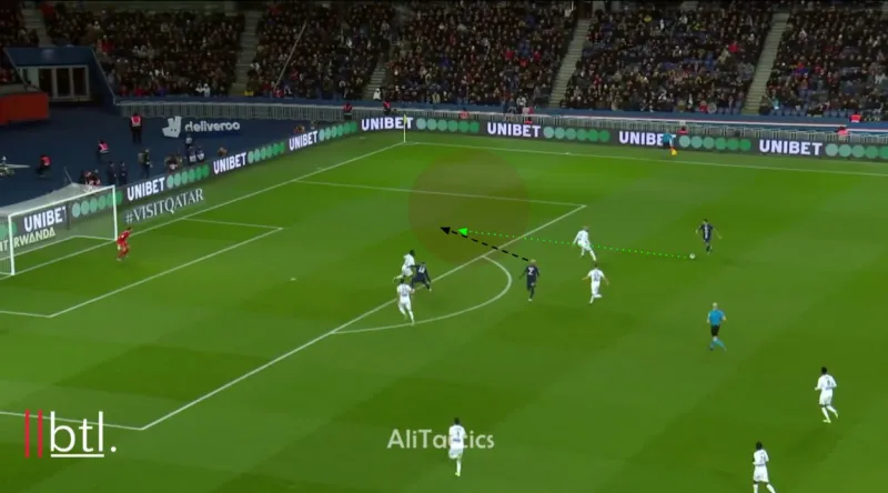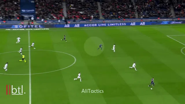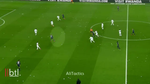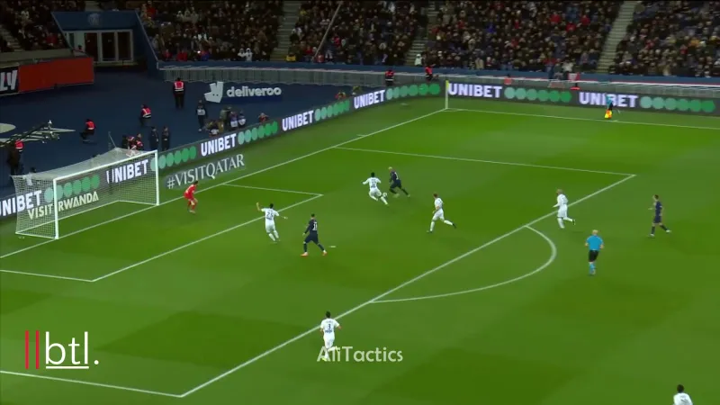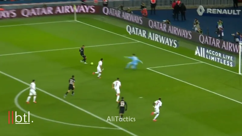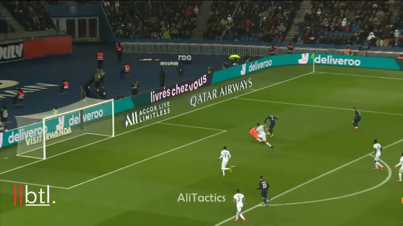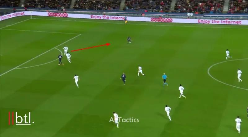 勒塔莱紧跟在姆巴佩身后想要限制他的行动,但他没有意识到这样让他留下了身后原先所处的空间。姆巴佩示意向防守球员身后传球,而内马尔也适时地送出了精妙的直塞,这让姆巴佩成功进入到与蒙彼利埃门将迪米特里-贝尔塔德的一对一中。