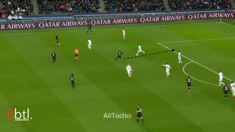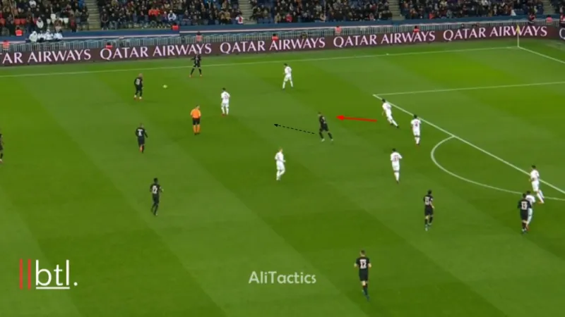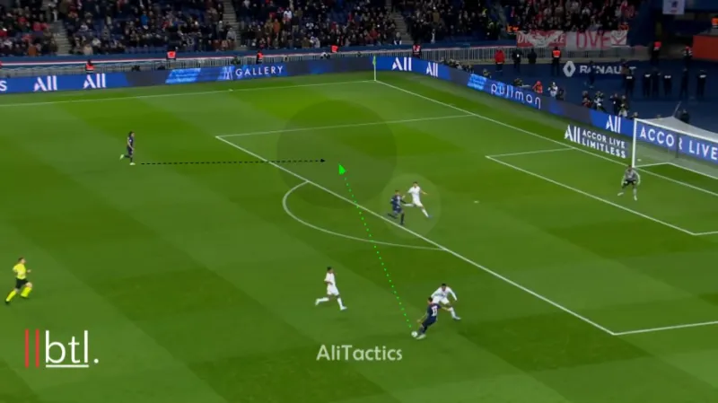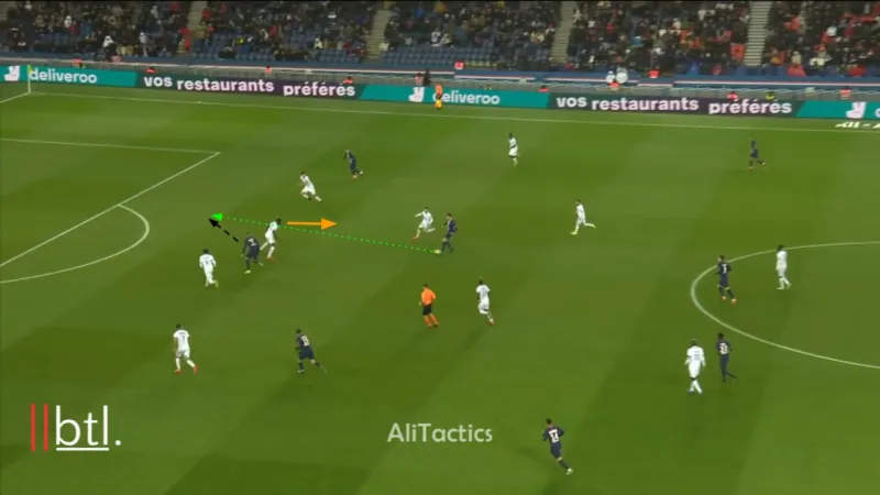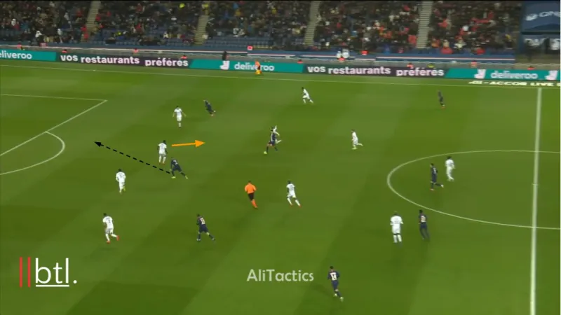 在这次进攻回合中,德拉克斯勒正对球门带球推进。第戎中后卫布鲁诺-埃库勒-曼加一心想要拦截德拉克斯勒的传球,由此视野盲区内的姆巴佩立即向他身后的空间行动。