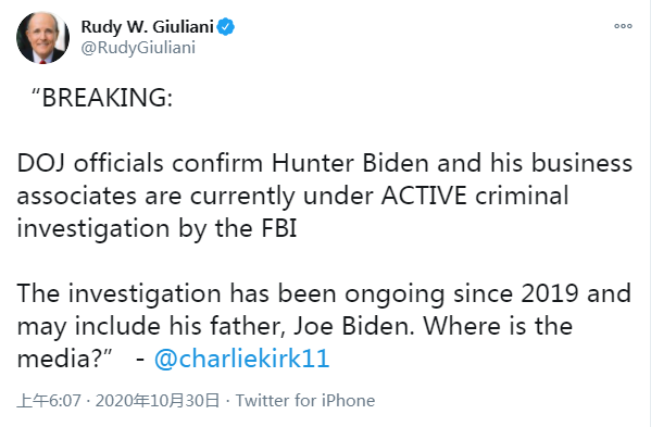 还有一则消息:2020年10月30日,前纽约市长朱利安尼最新推文:司法部官员证实亨特-拜登和他的商业伙伴目前正在接受FBI的刑事调查。自2019年以来调查一直在进行,可能还包括他的父亲乔-拜登。