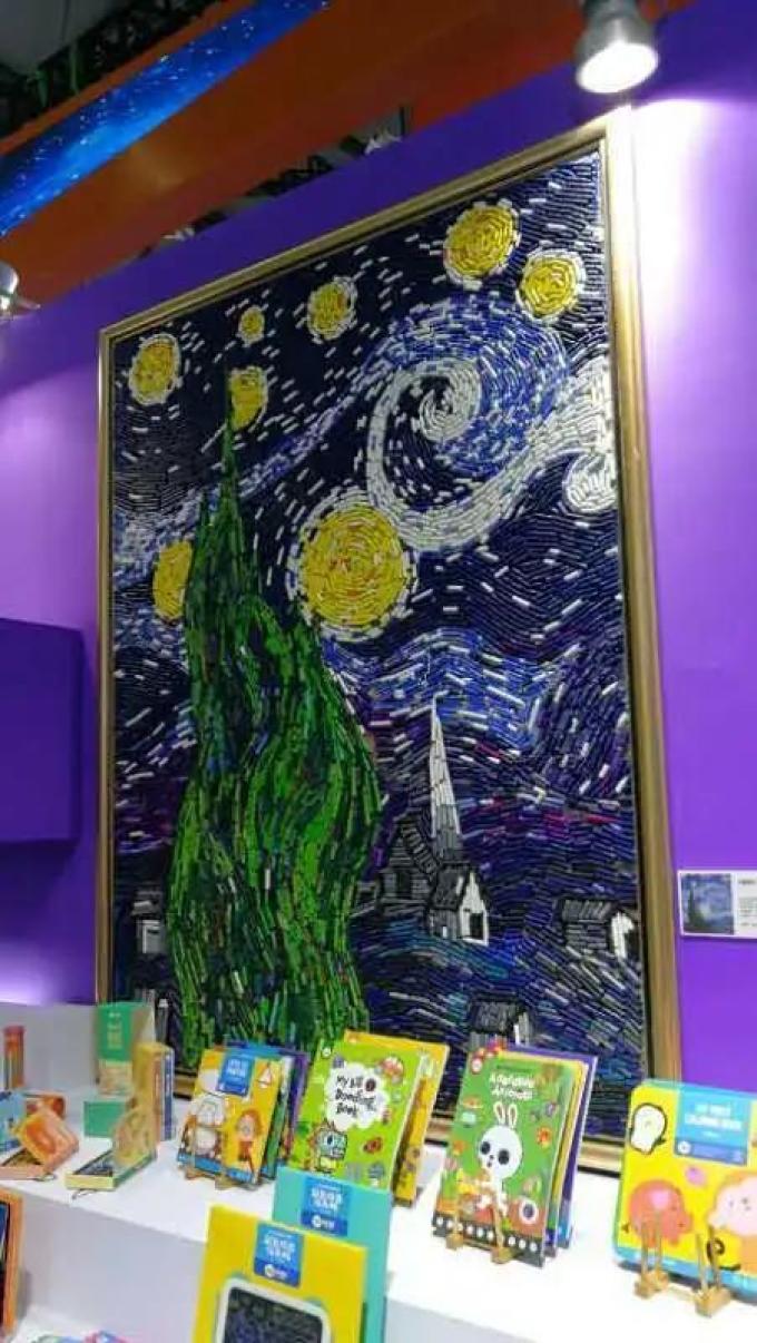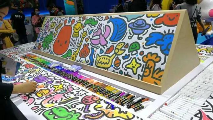 进门的地方还设置了一块可以随意涂画的展台,各种五颜六色的画笔非常吸引人。