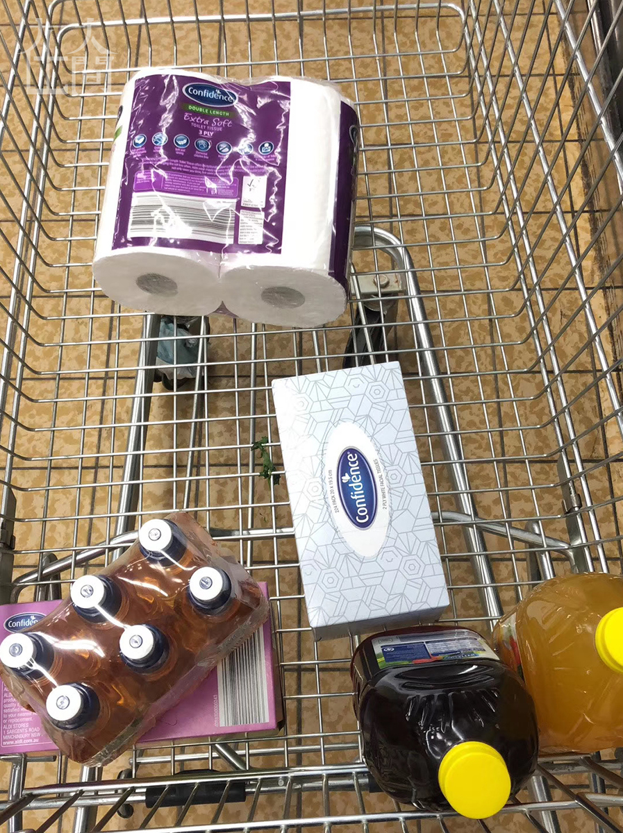 ■ 3月20日,李旻在超市采购,抢到了两卷厕纸。此时,超市已经对厕纸限购,每人限购两卷。受访者供图