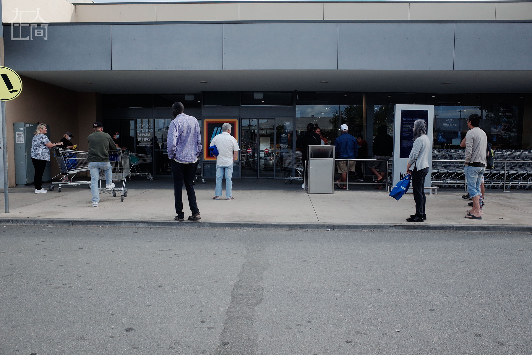 ■2020年3月29日,维州北部某镇,市民在超市门口排队等待进场购物。部分当地市民已经开始戴口罩,并且刻意保持社交距离。黑曼巴/图