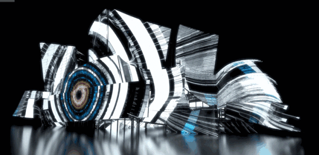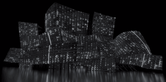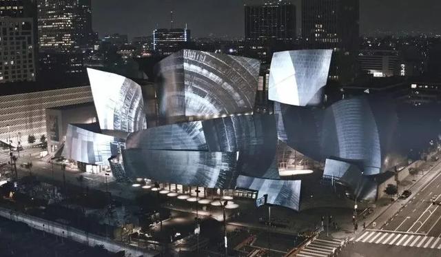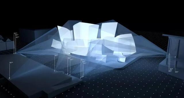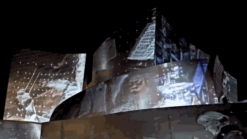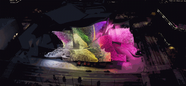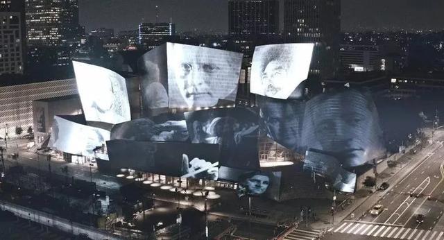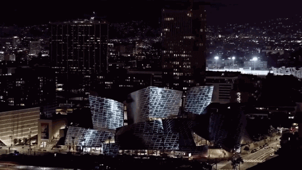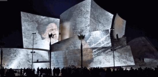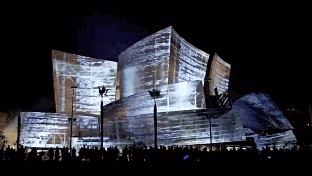 投影在当代著名建筑师Frank Gehry设计的音乐厅上