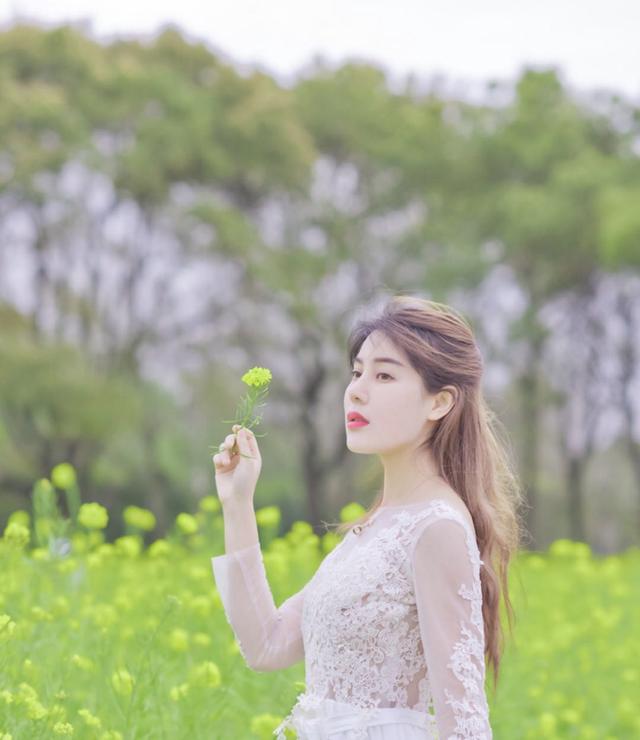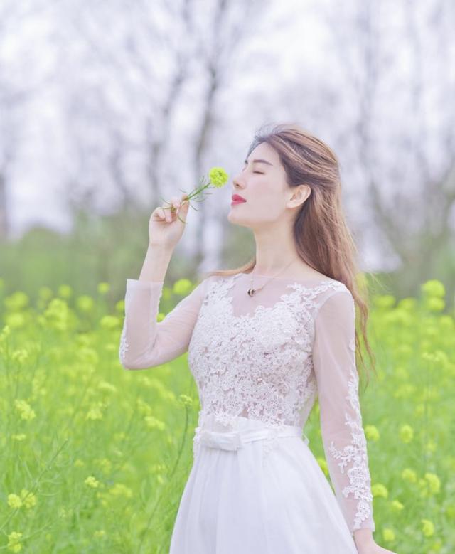 到花海游玩,除了拍照,当然也要看看美美的花,如果不知道该怎么摆姿势,可以像下面的女生一样,一手拿花仔细看着,一手提起裙摆,头稍稍低下,很简单的姿势却能拍到人物自然好看的状态,也很显优雅的气质。