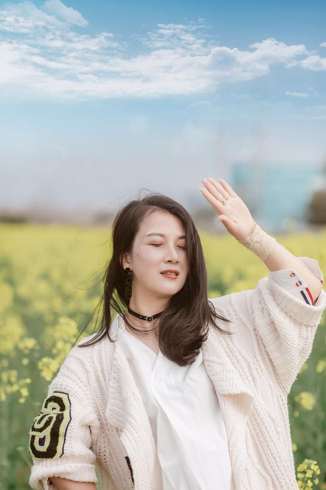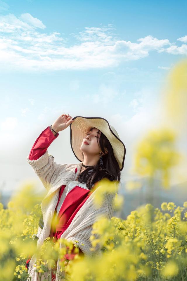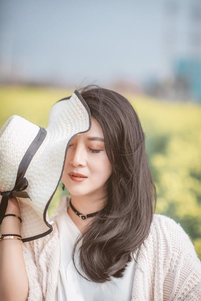 中年的女士外出拍照时都会常备丝巾、帽子、墨镜等道具,像在花海中拍照,大家就可以将这些道具用起来,比如站在花海里,拿着帽子挡住自己的半边脸,这样既能显脸小,也很端庄有气质,拍出简约美。