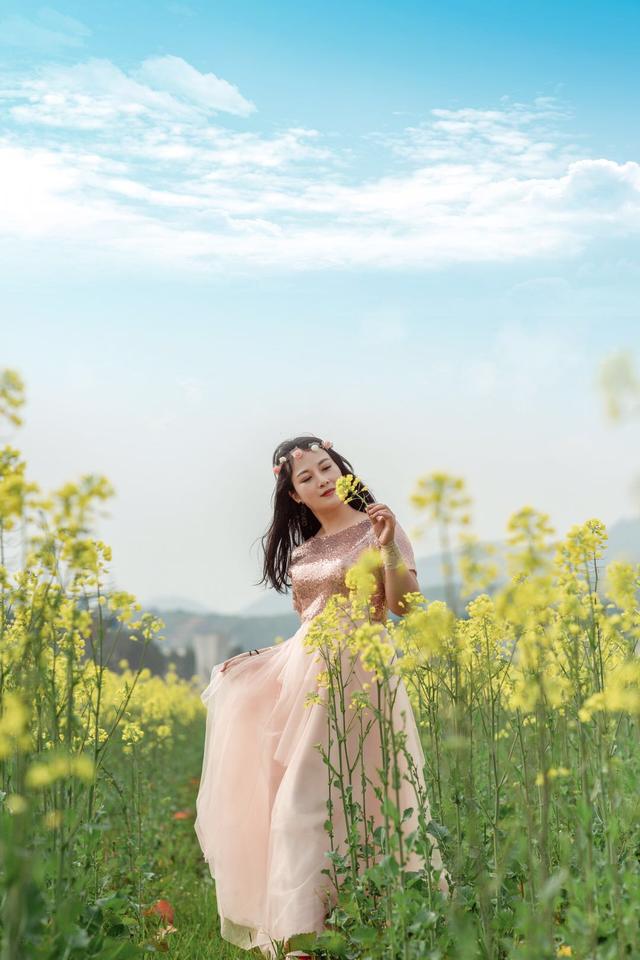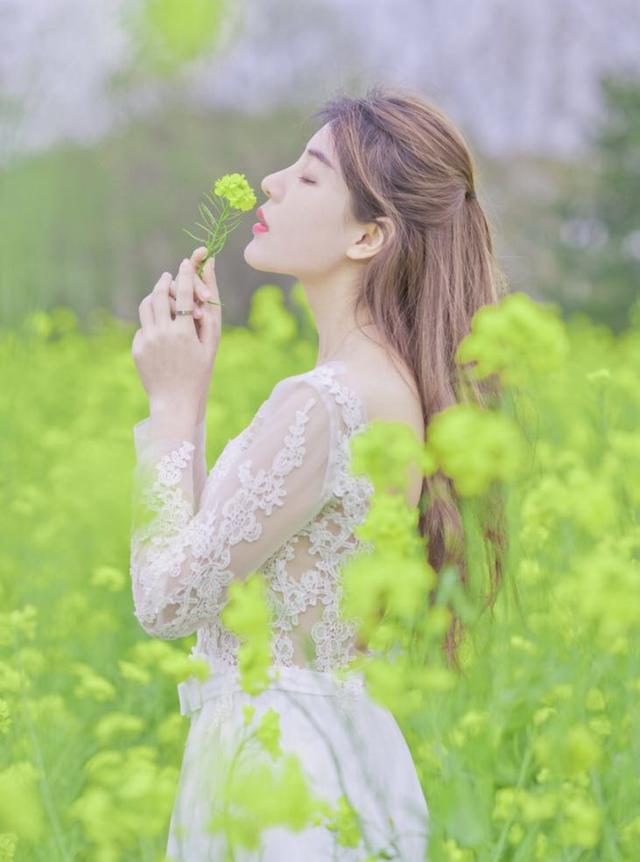 不管是何种花,都会有其独特的花香,所以在花海中拍照,除了看花、摸花,也可以闻闻花香,不管是弯腰闻花香还是手拿落花闻都可以,参考下面的女生的姿势,侧身对镜头,手拿花细细的闻着,安静唯美的画面也能拍出气质感。