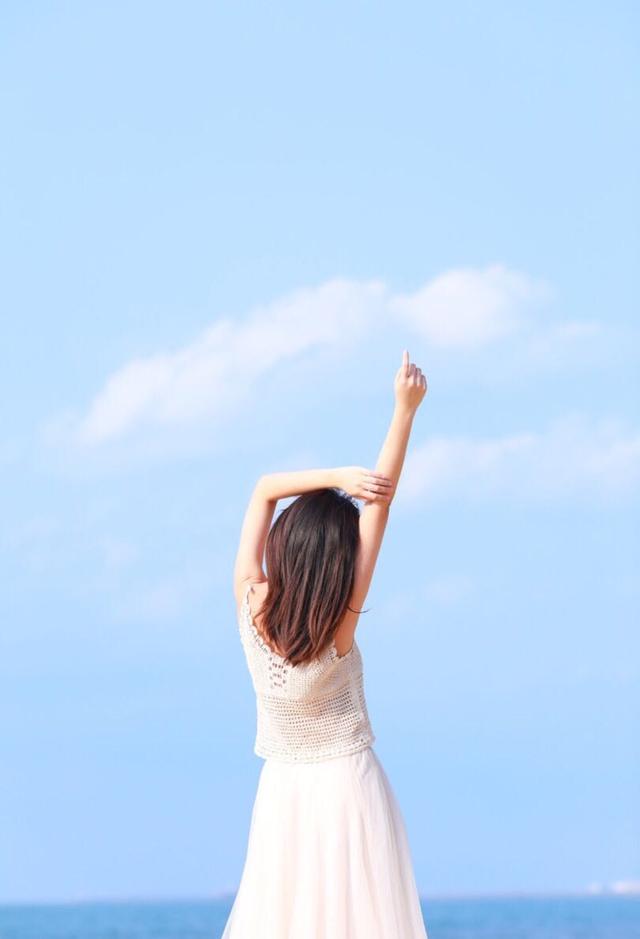 有些女生天生就有镜头恐惧症,那在旅行拍照时可以背对镜头,只留下个神秘感满满的背影即可,找一个简单好看的背景,利用人小景大的技巧,让人物和蓝天白云很好的置于同一画面,即便是简单的伸手放松的姿势也能拍出满满文艺感。