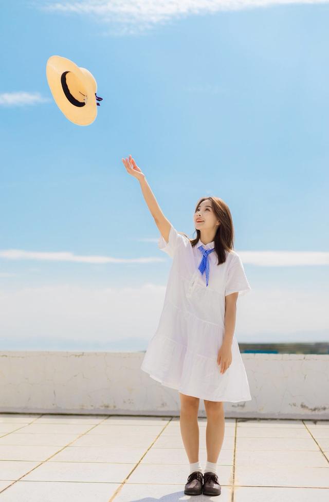 道具在旅行中是不可或缺的,像墨镜、帽子、相机等基本是旅行常备的道具,如果实在不知道该摆什么样的姿势,那可以借助这些道具来摆拍,像下面的女生一样,拍照时将帽子扔起来,让摄影师抓拍这一动态画面,成片也很生动有趣。