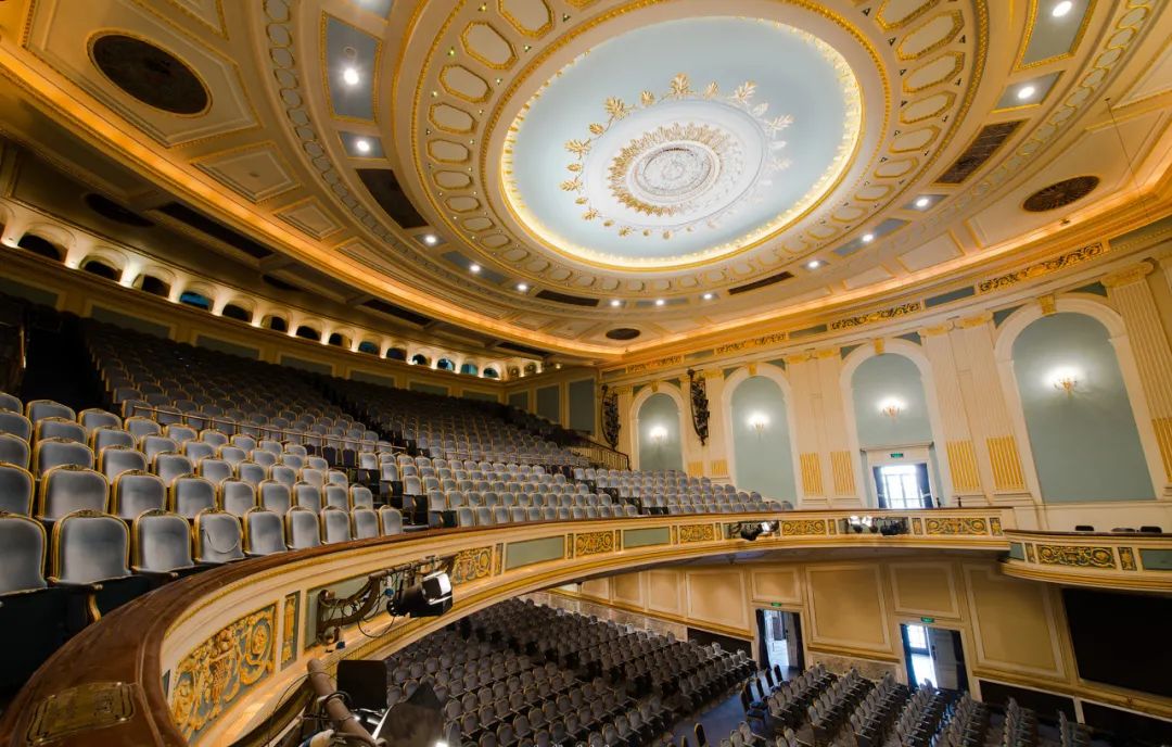 全国第一座音乐厅走过14年的岁月后,经历了平移,拔高,成为了眼前的模样。灰暗重新焕发新生。仰头,蓝雕花穹顶在剧场的灯光下,深邃、曼妙,像要将人吸进去。金箔与“海上蓝”的座椅,聆听过一场又一场悠扬。