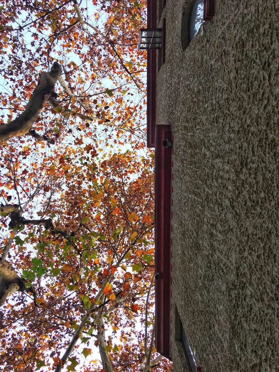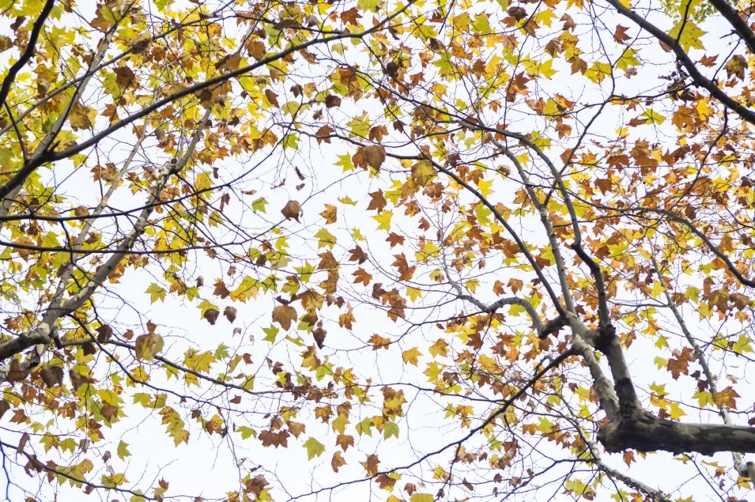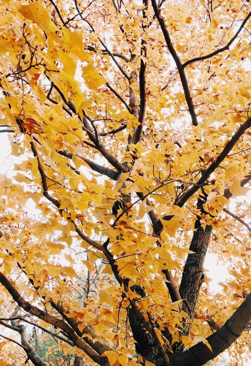不同的两棵树,迈着步伐的速度也不同。一棵已经浅黄了,一棵却还是褐色,真的成了一盘调色盘。工作日的清晨,人声低语,看那边的老人打着太极,看这边的孩子捡着落叶。平凡又美好。