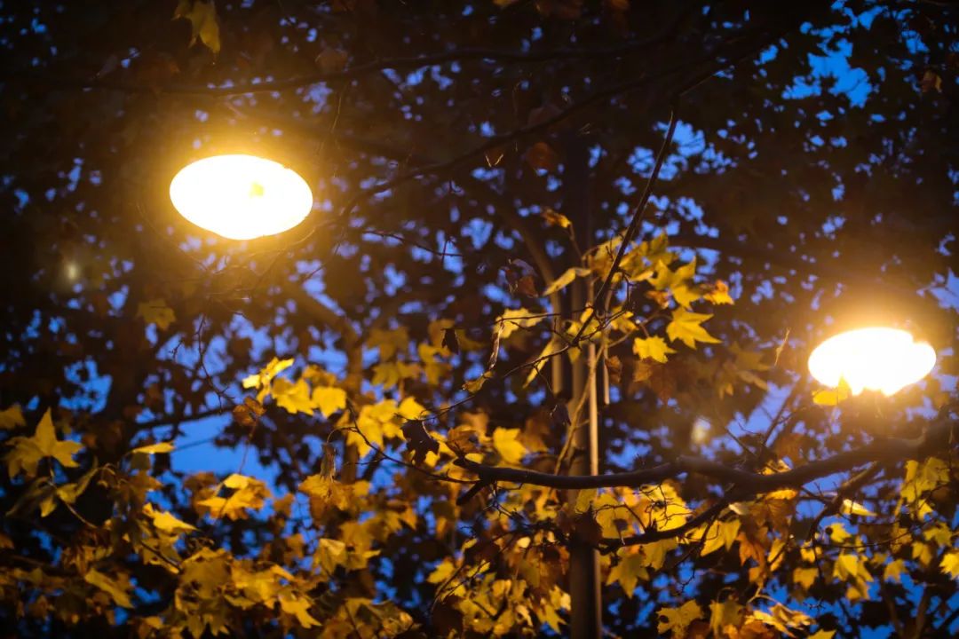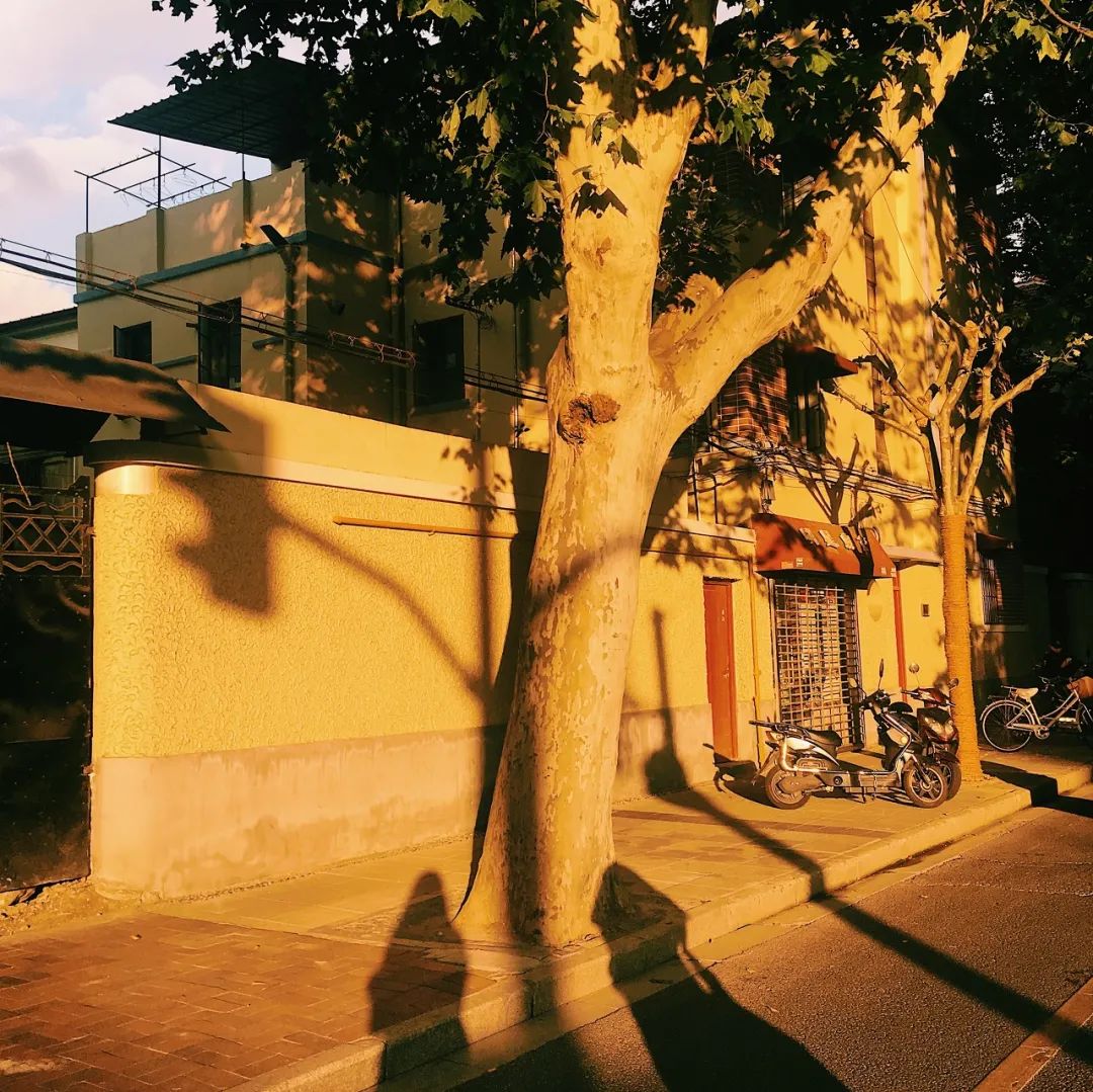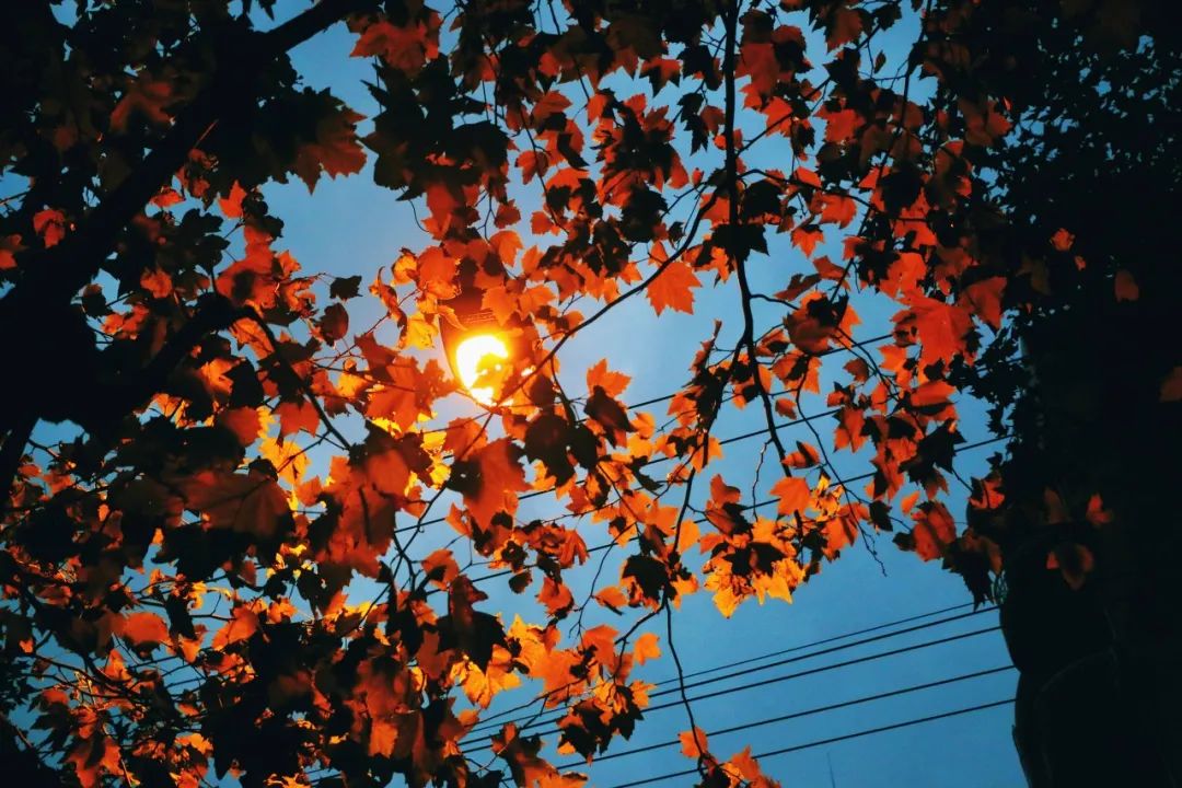 朦胧感是昏黄路灯的杰作,它们像一个个挂在树上的小月亮,把整棵树都照亮了。透着黄色灯光的叶子,脉络分明。梧桐叶的光影被打在老房子墙壁上。摇曳,婆娑,低语。