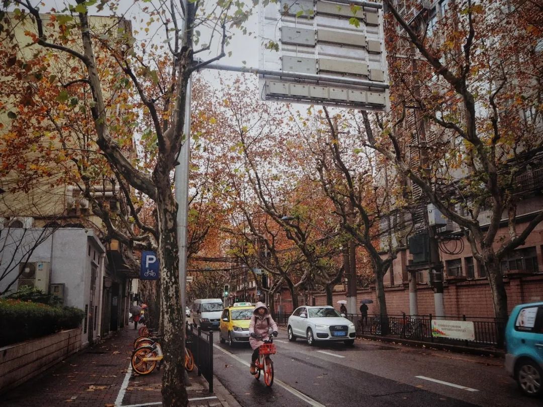 原来,上海也是有秋天的,它在被都市人遗忘的一个个碎片里。在涌出地铁人群的呼吸中,在肩膀沾上的黄叶上,在稀释喧嚣的树叶间。疲累了一天,走出办公室门,扑面而来的秋风;踏上单车,穿梭,阳光掠过头顶,一棱一棱的光影。