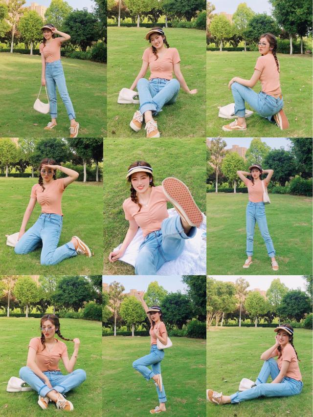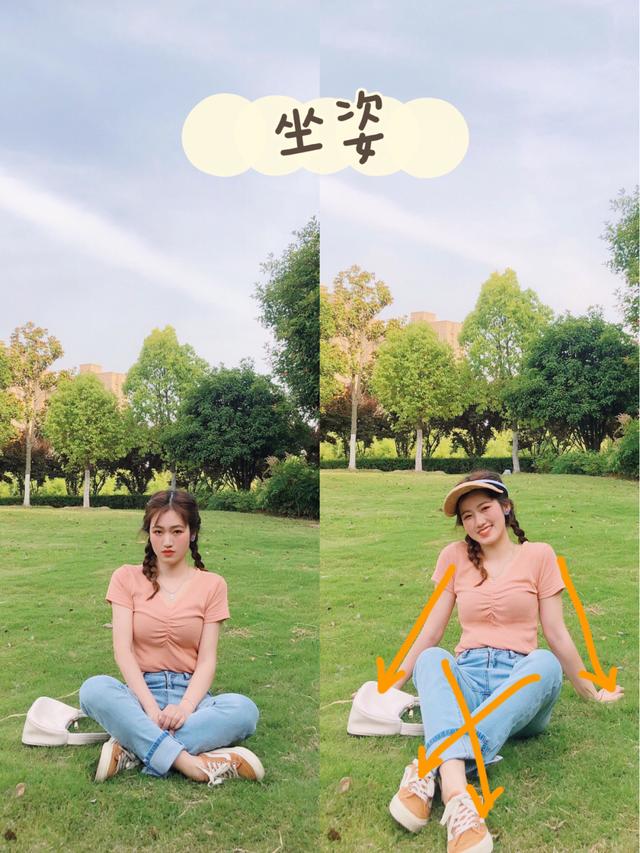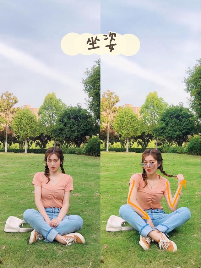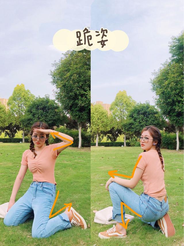 最近流行的跪姿,在公园的草地也是超好看的,可以让自己采用身体三角形的构图方法,把手脚都运用起来,比如手扶额头、来个斑比跪,或者让自己侧面对着镜头,让一只脚撑着,手搭着膝盖,来一个欧美跪姿,这样的画面会更有张力更好看。