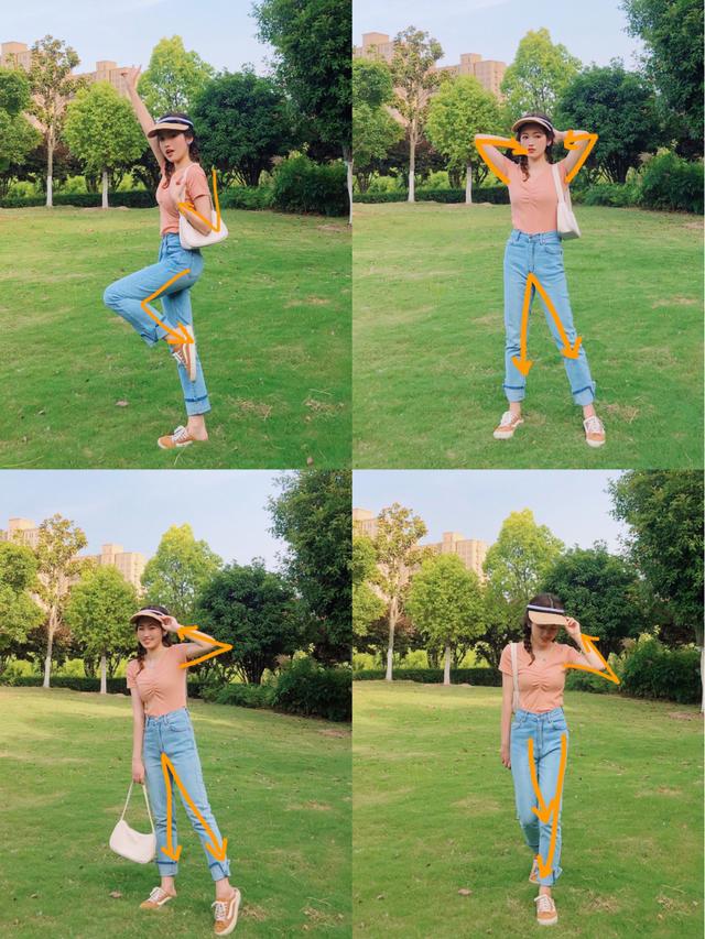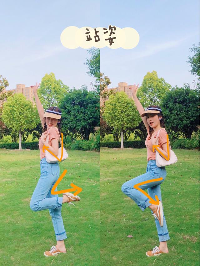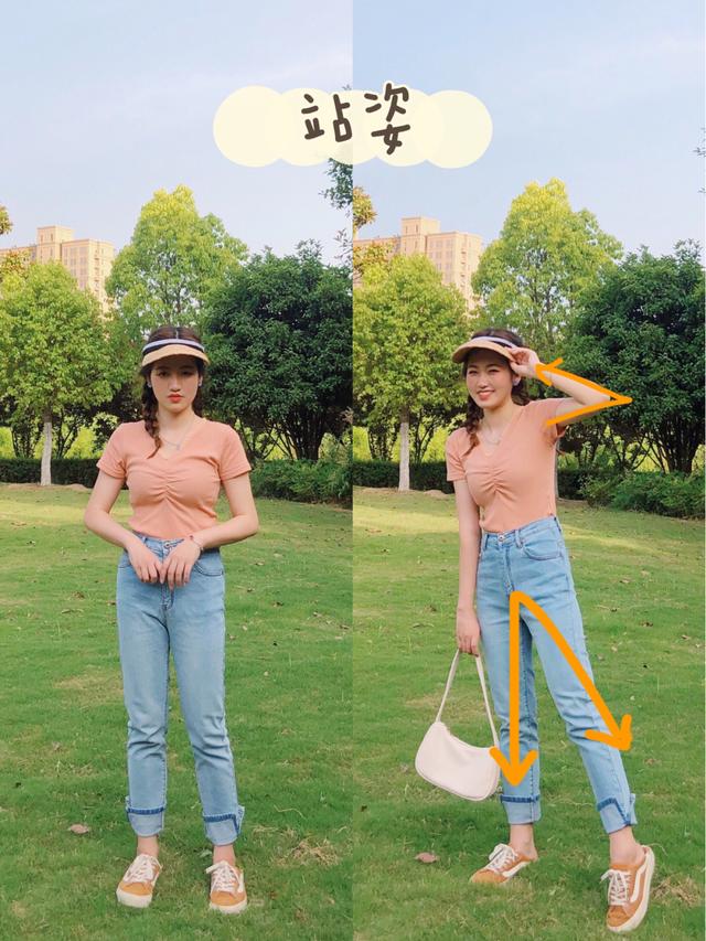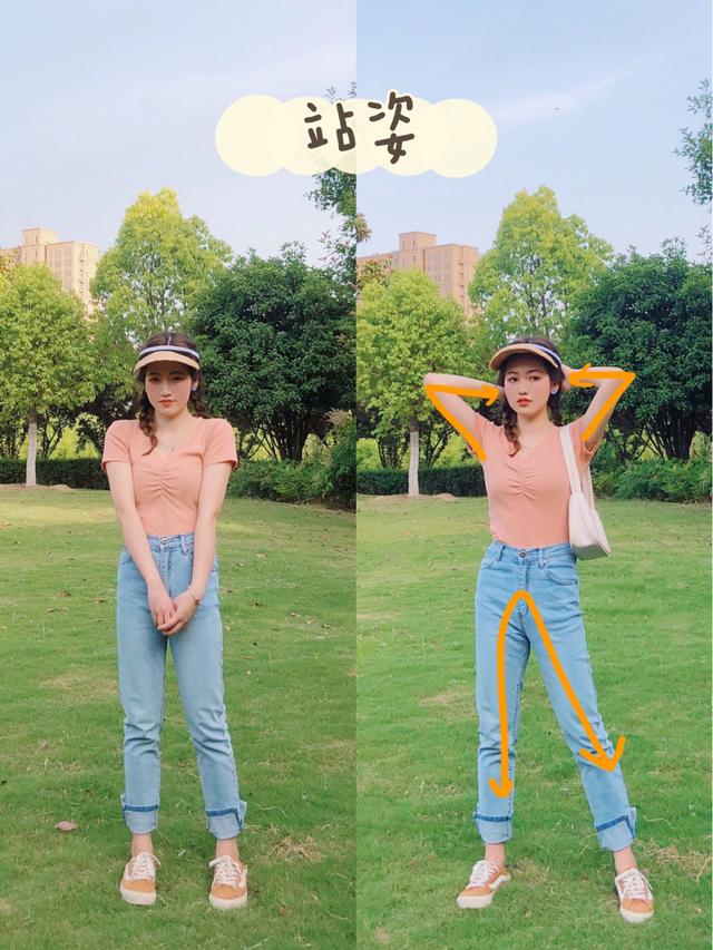 公园草地拍站着的照片,不要让自己在面对镜头的时候,呆呆的站着会显得特别的呆板,而且手臂贴起来也显胖。(正确地释放如下)