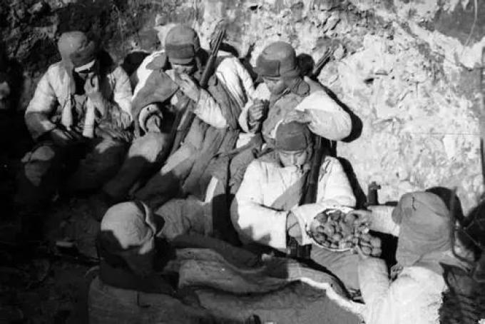 一口炒面一口雪,哈一口气融化一层土豆吃一层,再加上一身破烂单薄的军服,几乎就是每一个战士的全部后勤保障。
