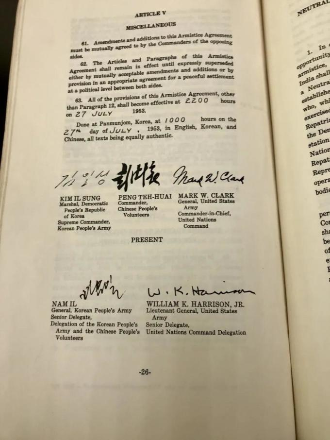 众所周知,朝鲜战争经过南北朝鲜的内战,志愿军与联合国军的五次大规模战役,又经过多轮打谈交替的艰苦谈判,终于在1953年7月27日22时结束。这天,中美朝三方签署了《关于朝鲜军事停战的协定》(南朝鲜没有签)。