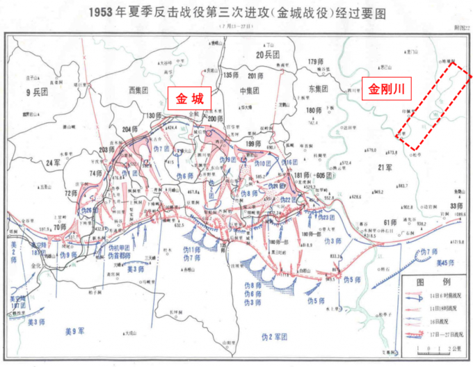 从这张图上可以清楚地看到,金城战役主要围绕金城以南突出的敌军为目标,河流金刚川位于主战场的东侧。