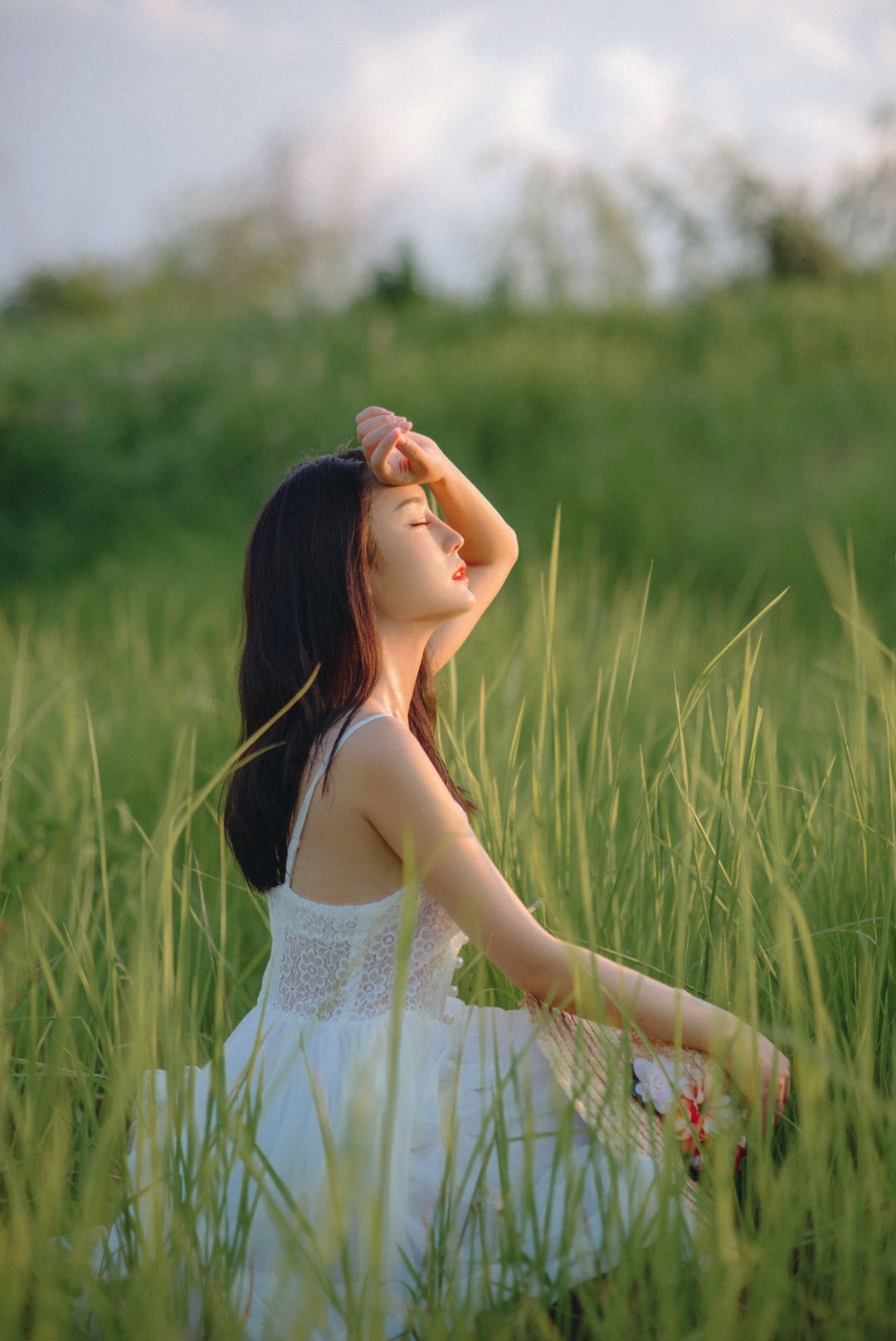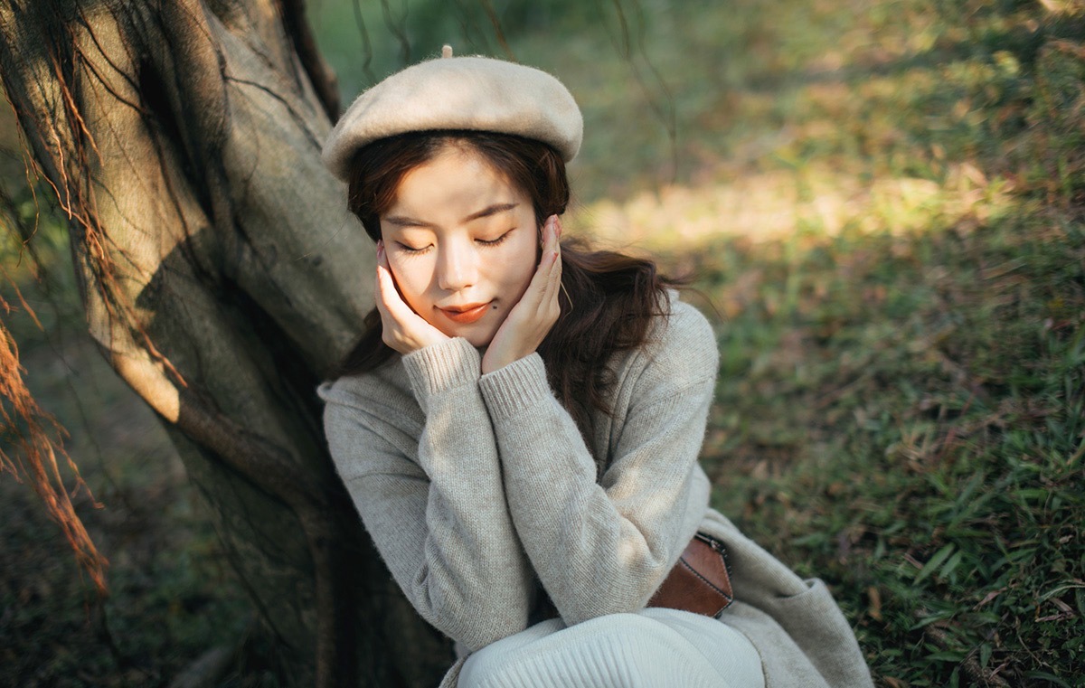 你也可以尝试让整个手臂都出现在画面中,手臂形成的封闭曲线可以起到视线引导的作用,像下面的女生般,一手放在额头上,观众的视线会跟着手臂延伸到人物的脸上,画面主次分明,搭配上一个闭眼感受的姿势,轻松拍出情绪风和唯美感。