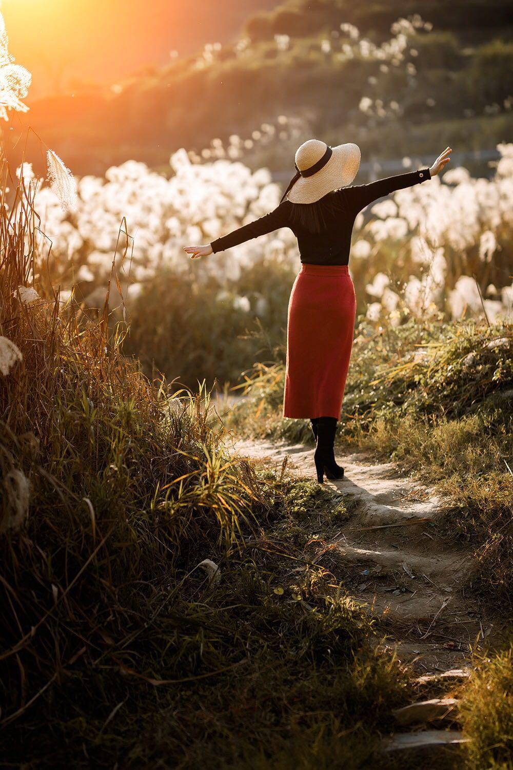 逆光是一种很温柔的光线,一般都是在傍晚太阳即将下山的时候才有的光线,所以中年女士拍照的时候可以利用这样的逆光光线来摆拍,像下面的女士一样,怎么摆拍怎么美,温柔好看有气质。