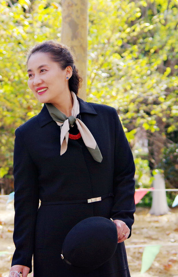 中年女士拍照,可以学下下面的女士一样,自然地站立在镜头前面,然后单手叉腰,另外一只手自然垂直放着,这样看起来很有气质,配合头部稍微歪一点点看着镜头笑,很美。