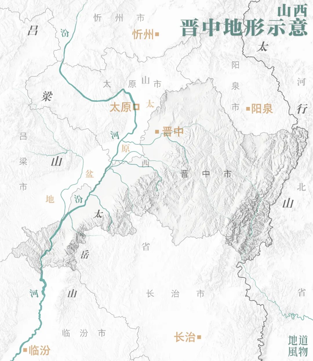 西部汾河浩浩荡荡,过境128千米,收纳萧河、象峪河等河流之后,在晋中盆地(也叫太原盆地)冲积形成平坦肥沃的良田。汾河东岸的晋中各县(市),充分利用河流灌溉之利发展农业,是山西较早开启农业文明的地区,太谷的饼、平遥的牛肉、榆次的烧酒,远近闻名。