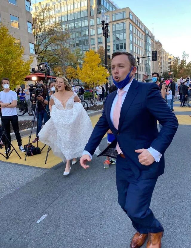 一对新人从婚礼中跑出来去参加庆祝仪式