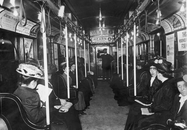 图为百年前美国纽约地铁车厢内的景象。世界上最早的地铁是英国伦敦地铁,于1863年(清同治二年)1月10日正式投入运营。美国最早的地铁是1897年(清光绪二十三年)建成并投入使用的波士顿地铁。美国纽约的地铁则是1904年(清光绪三十年)开通的。