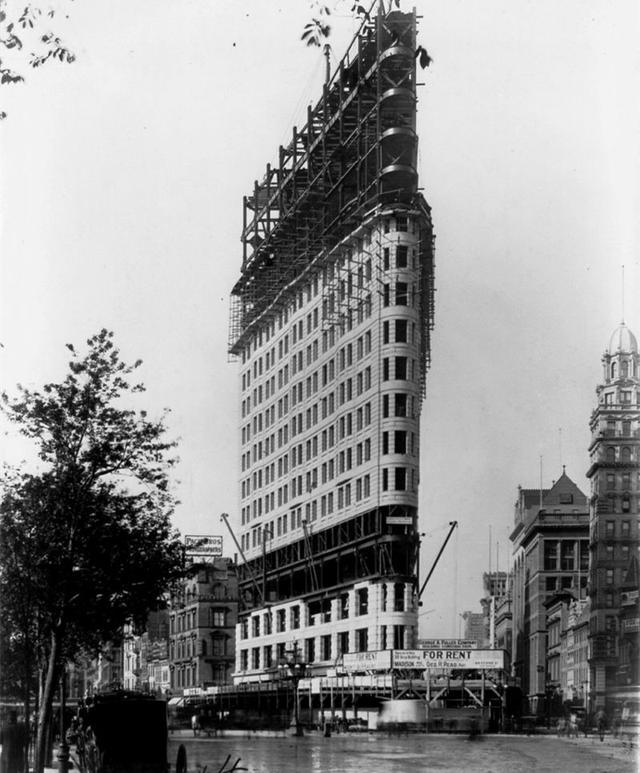 图为百年前还在建造中的纽约熨斗大厦。这栋大厦造型独特,为三角形,这栋共22层楼,高87米的大厦在1902年(清光绪二十八年)建成完工。历经了百年,这栋大厦如今依旧矗立在纽约街头。