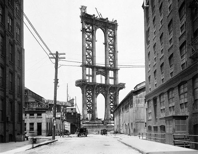图为百年前还在建造中的纽约曼哈顿大桥,该桥于1909年(清宣统元年)建成。与曼哈顿大桥同样横跨纽约东河之上的布鲁克林大桥比曼哈顿大桥建成还要早,布鲁克林大桥在1883年(清光绪九年)建成。布鲁克林大桥是世界上首次以钢材建造的大桥,该桥全长1834米,曾是世界上最长的悬索桥。
