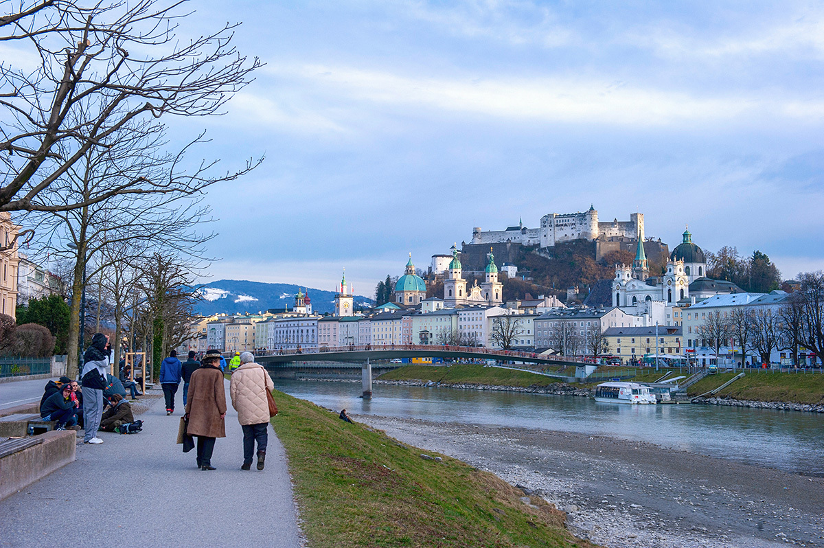 流经萨尔茨堡的萨尔茨河,在河对岸是欣赏老城风光的绝佳视角之一。天气好的时候,河堤草地上,坐满了休闲的当地人,有不少会拿着乐器弹奏,音乐早已成为这座城市不可或缺的元素之一。