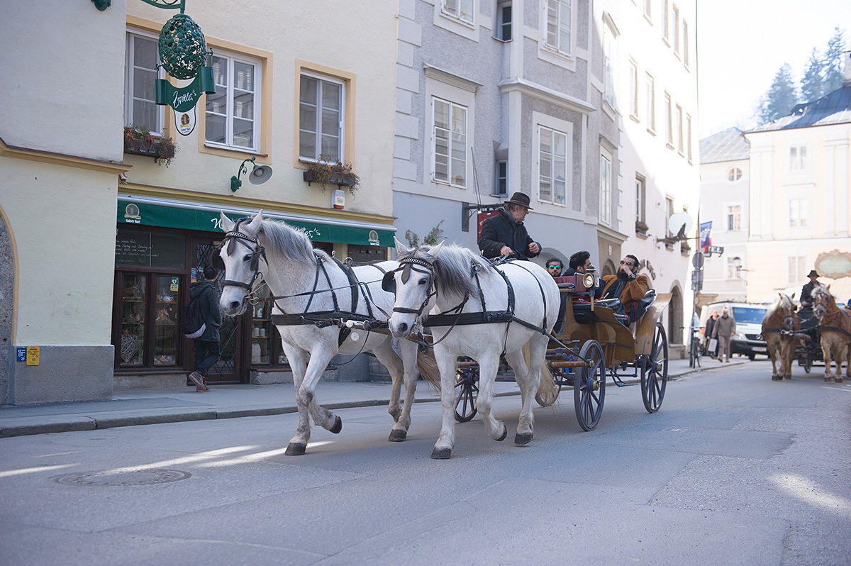 老城区萨尔茨堡大教堂的周围,有许多复古的中世纪马车,游客可以体验乘马车逛古城。这样的马车也同样出现在《音乐之声》,女主角带着七个孩子们乘坐过。
