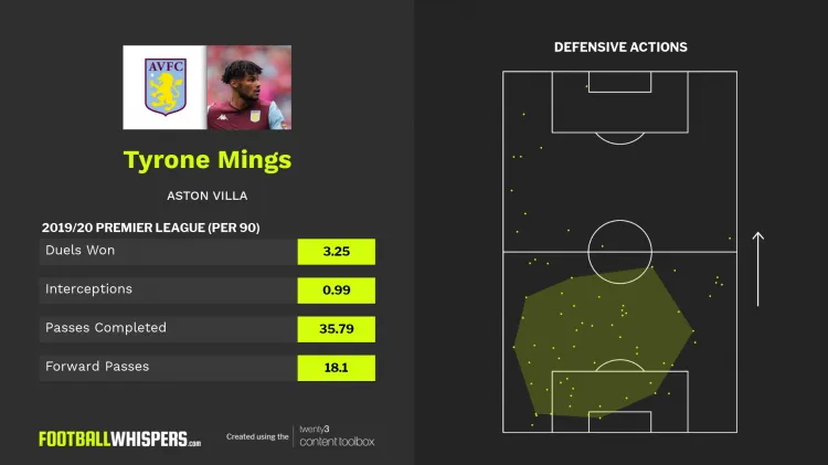 如果你觉得新冠病毒爆发之后的生活开始变得单调,替阿森纳球迷想想吧。正当枪手的前景逐渐走向光明之时,“熟悉的感觉“意外地又回来了。去年十二月中旬阿尔特塔挂帅后,阿森纳一度在联赛中11轮只负一场。但联赛重启后一周,这支球队之前建立起的所有信心已经全部化为泡影。在曼城手下的一次全线溃败?完成。大卫-路易斯一手造成的后防线崩溃?完成。惨遭保级球队布莱顿绝杀?完成。被取得胜利的对方球员挑衅?完成。漏洞百出的防守对于阿森纳来说不是什么新鲜事。对于阿尔特塔来说,巩固防线应当是他夏天补强任务中的重中之重,这甚至不会被周三大卫-路易斯续约一年的事实动摇——在曼城的惨痛经历应该已经让他学到了这一点。The Athletic报道称,阿森纳最近有意于阿斯顿维拉后卫泰隆-明斯——这似乎听起来顺理成章。虽然从表面来看,签下一名保级队的中后卫似乎不算是什么壮举。但明斯着实利用自己出色的发挥,拯救维拉于水火之中。这位27岁的球员甚至在2019年底就迎来了自己的英格兰队首秀。如果阿斯顿维拉注定只能在顶级联赛停留一个赛季,明斯的争夺者们将对他虎视眈眈。明斯的特长是什么呢?从数据的角度看,这位曾效力伊普斯维奇和伯恩茅斯的后卫是一个很有趣的案例。截至目前,在阿斯顿维拉的四名主力中后卫(包括科特尼-豪斯、埃兹里-孔萨、比约恩-恩格斯和明斯)中,明斯是最不“活跃”的。和其他人相比,他的抢断(每90分钟0.51次) 、拦截 (每90分钟0.99次)和争顶(每90分钟3.45次)的次数都是最少的,但这并不是一个劣势。对于防守端的数据,人们最经常犯的错误就是认为数量反映质量。很有趣的一点是,考虑到明斯作为保级队的一员,我们倾向于认为他总是处于疲于应付的状态。但是明斯的特长其实是准确率和对时机的把握,而不是对所有试图进入他防区的物体盲目出脚。这才是他进入索斯盖特法眼的原因。