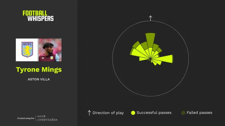 “他经常能上场,我认为他会把这场比赛当作一次很好的机会,”在明斯的国家队首秀前,索斯盖特在保加利亚接受ITV采访时表示,“他擅长沟通,能把队友组织起来,这一点让我们印象深刻,眼下,我们的后防线就需要这个。”在之前提到过的防守四人组里,明斯上抢失败次数是最少的——每90分钟仅0.08次。相比之下,每90分钟抢断数最多(1.36次)的豪斯,每90分钟上抢失败5.64次。数量不是一切。对于195公分的明斯,我们永远不会在评估他的表现时忽视他的身体条件。他制空能力一流,争顶成功率达到了60.9%。明斯极其显著的一个优势是,他每90分钟封堵对手射门1.74次。在这项指标上,整个英超无人能与这位来自巴斯的球员比肩。这或许可以说明:1.明斯在防守时是相机而动,不是先下手为强;2.他充分发挥腿长和擅长阅读比赛的优势,找出机会掐掉对手的攻势。明斯还有哪些需要进步的地方呢?从明斯在阿斯顿维拉时期的数据看,传球是他最需要提升的地方。但实际上,没有人会苛求这名27岁的球员在传球到位数上达到拉波特(每90分钟87.18次)和范戴克(每90分钟77.87次)的水平。明斯每90分钟传球45.3次,在[实际出场时间/理论可出场时间]≥20%的所有英超中后卫里排第40位。他每90分钟传球到位35.79次,仍然排在第40位。总体来讲,明斯79%的传球成功率还算差强人意。本赛季,阿斯顿维拉每90分钟传球374.9次,英超倒数第三,每90分钟长传60.9次,英超第十。