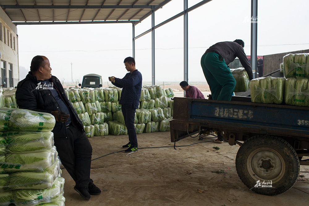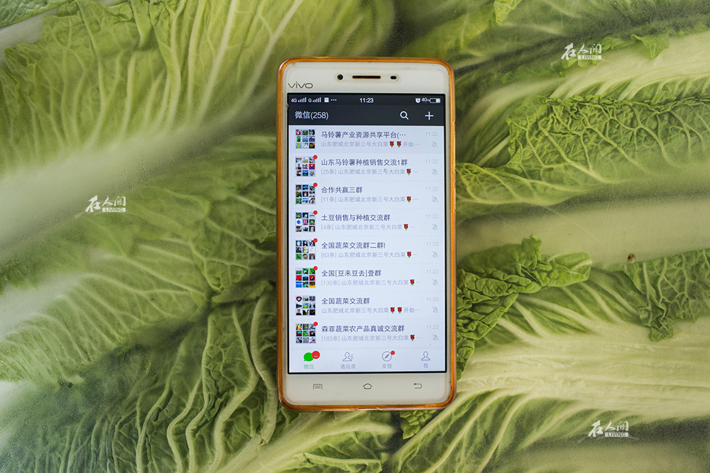 在一家蔬菜收购门面房前,李海鹏将存货照片发给客户。他说,在附近的村镇,他的同行不下100人。大家每天在客户和菜源之间忙碌,业务的成功,对每个人都是互利的事情。