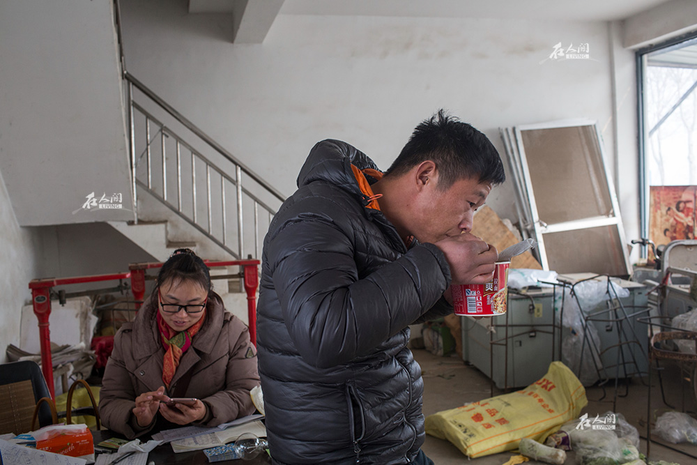 在潘庄村东边的蔬菜交易市场,李海鹏有一个找族家叔叔借用的门面房。2016年12月中午,李海鹏在门面房吃泡面,女友王芳在帮他做账。由于事业刚刚起步,李海鹏的收入并不稳定,业务多时,一天就可以有两千元收入,“感觉比在外打工要好,至少可以陪着家人”,李海鹏说。