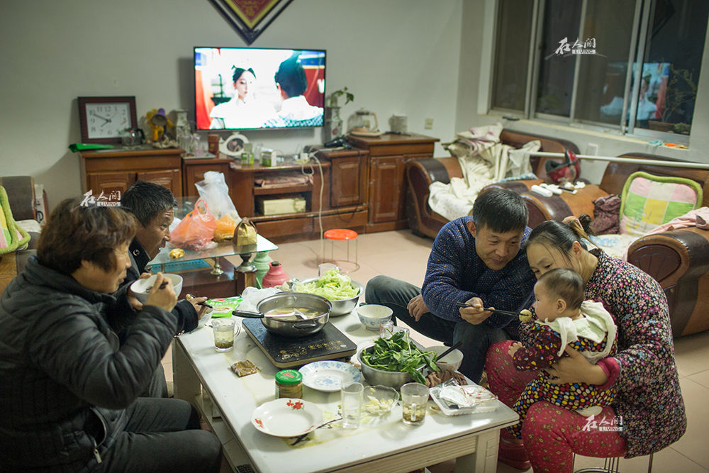 2017年3月,李海鹏和王芳“奉女成婚”。婚后,小两口搬回潘庄和父母一起居住。李海鹏说,婚后自己的压力增大了,他要为父母和妻小负责任,做好业务。图为2017年12月,李海鹏在吃饭时夹菜逗女儿,一家人其乐融融。李海鹏的母亲说,海鹏结婚后变得顾家,和父母之间的交流也多了。