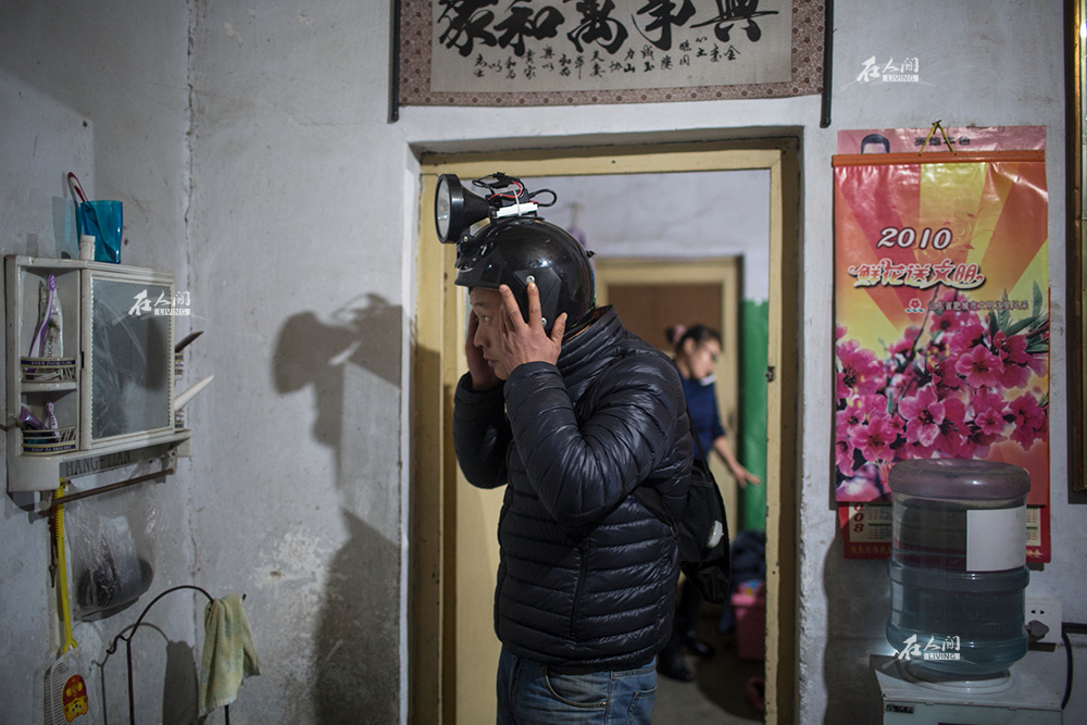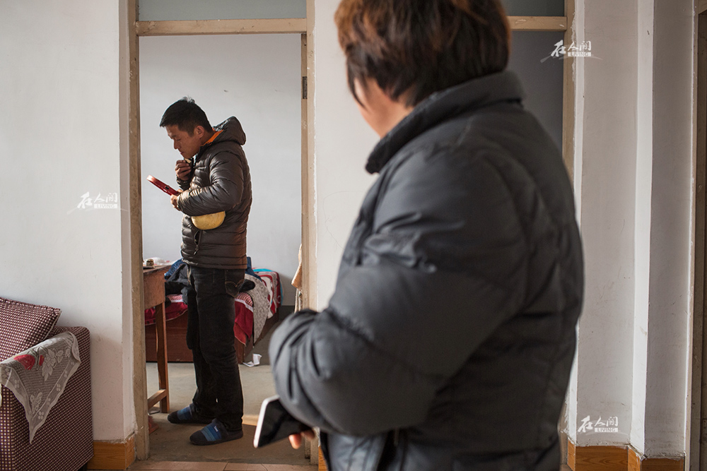 2016年12月,李海鹏刮胡子准备出门,母亲在一旁看着他。
