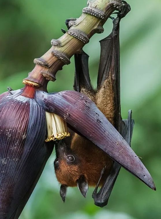 在芭蕉科植物花朵里取食的印度大狐蝠(Pteropus giganteus)。图片:Manojiritty / Wikimedia Commons