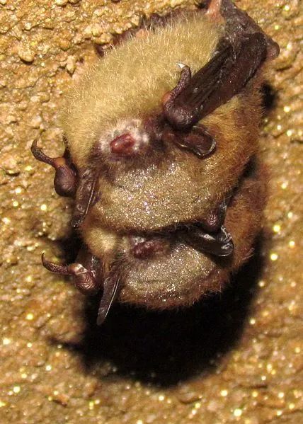 白鼻综合征由真菌Pseudogymnoascus destructans引起,2012年在北美爆发,至今未找到有效的解决方法。图为感染白鼻综合征的小棕蝠(Myotis lucifugus)。图片:Larisa Bishop-Boros / Wikimedia Commons
