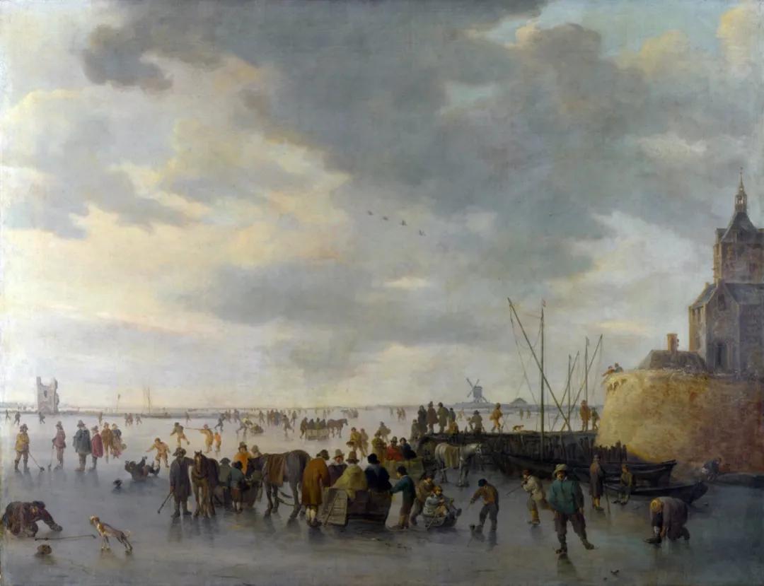 荷兰画家霍延的《冰上》,描绘荷兰西部港口城市的雪景,成功捕捉了冰雪覆盖的地面上,人物的神情动态、光线与空气的细微变化,以及云朵的浮动感 。灰褐两色点缀几笔红蓝,色调沉着含蓄 ,光影细腻动人。