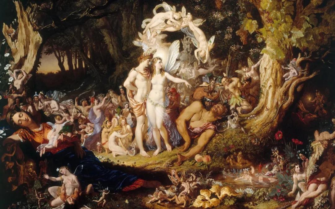 画作描绘莎士比亚戏剧《仲夏夜之梦》中,仙王和仙后安详睡去,象征和解的生灵立在画面中央。周围草木茂盛,百花盛开,万物自由,享受着宁静与平和。光明与黑暗泾渭分明,充满诗情画意和浪漫想象。