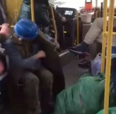 公交车上上来一个残疾的拾荒者