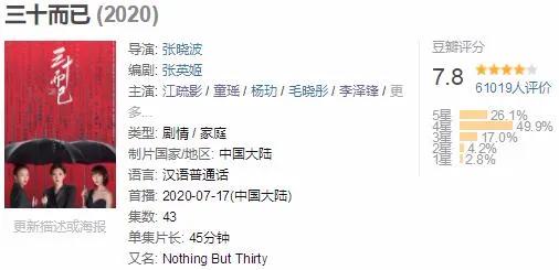 在豆瓣平台,《三十而已》刚开播之时,评分一度冲上8.2分,而目前该剧的评分为7.8分,四星好评占比超49%,评分人数已超6万人。