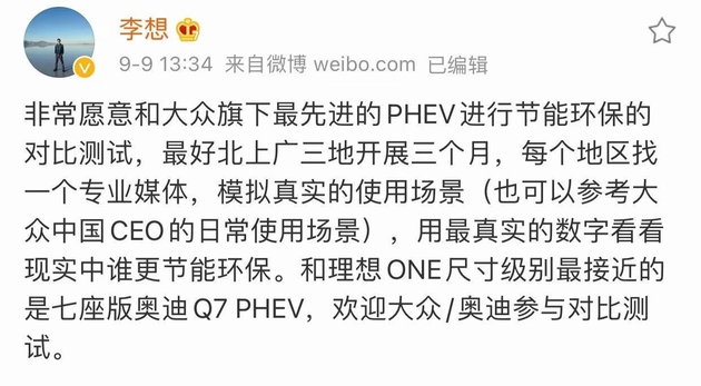 @梨视频【李想回应大众中国CEO:愿意和大众旗下PHEV进行节能环保对比】理想汽车创始人、CEO@李想 在个人微博表示,理想汽车愿意和大众旗下最先进的PHEV进行节能环保对比测试。以此回应此前大众中国CEO冯思瀚关于“燃油发电非常不环保”和大众中国研发部门负责人威德曼关于“增程式已经是过时的技术”的言论。