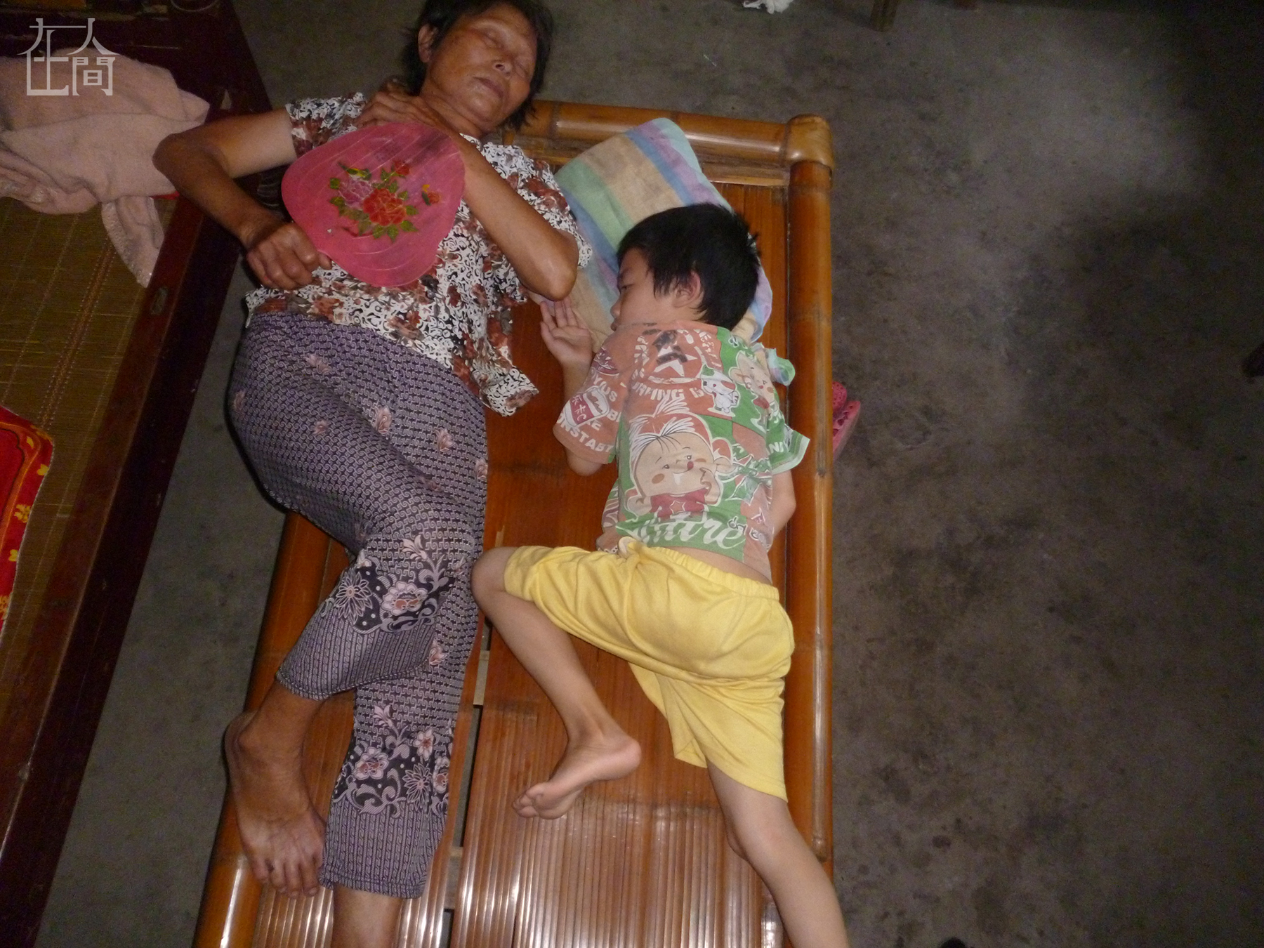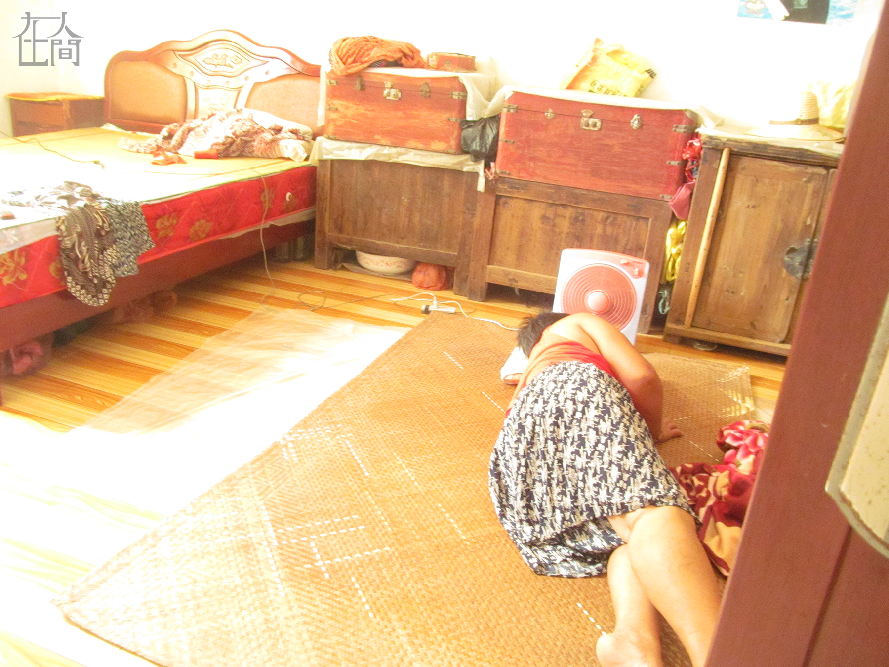 我奶奶在睡觉,那几天奶奶感冒了,所以才要睡午觉,平时她是不睡午觉的。但床上太热了,她就睡在地上,这样更凉快。